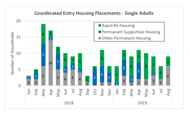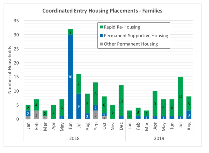 These numbers are complicated because they are only as good as the information collected and the accuracy of it being updated. The drop in single numbers above is because there was a major list clean up, not because people actually got housed. The actual people counted has stayed the same. The charts below show how many people are getting housed (that we know of) and again, look at the charts closely they have a different scale so they might be misleading. Basically we are lucky if more than 10 singles or more than 10 families get housed in one month.