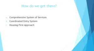 She wants to end with strategies they are working on in the community. She says that a lot of people think that since phase 3 is on hold that we don’t know where we are going with permanent supportive housing, but we talk about it on a daily basis. We want to support not only what we are doing now, but we want to have it in all the affordable housing we are trying to support. Right now we are still strengthening the relationships with the nonprofits and private developers. The new Affordable Housing Fund RFP asks developers to work with the local nonprofits, especially with nonprofits working with people experiencing homelessness. We might not have a site based 30 units of housing, but we could potentially get 8 – 10 units of scattered site permanent supportive housing that is more in a mixed income situation. We have a variety of those coming, the Breese (Stone House and Road Home) that about 9 of the units are families who are coming right off of the permanent supportive housing list. Another 8 units will open soon with Stone House and Road Home. They also have a “moving up” project that is 20 units that will be coming on. They will take people currently in permanent supportive housing that don’t need that permanent supportive case management and move into units with light case management freeing up the permanent supportive housing units. They also have 12 units that will work with individuals in the rapid rehousing range as well. They still have units coming on line, but they are a scattered site, mixed income type of approach. They also have made great strides working with the housing authority. Just recently as of September 5th the Housing Authorities applied for Mainstream Vouchers, the CDA applied for 45 vouchers, that will focus on the moving up philosophy. These would be for people who need the rent subsidy but don’t need the services any more freeing up more units. The state is looking at the medicaid waiver that will bring additional services through CCS. They also continue to network and problem solve with the Homeless Services Consortium. There is a housing first provider committee and case managers that also come together. That is a key place to problem solve, so they are looking at problems now but also how to move forward.