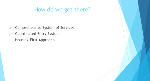 They have been talking since 2014/2015 about what we need as a community to prevent and end homelessness and we always come up with three things: comprehensive system of services, coordinated entry system and housing first approach. Some of the ideas came from national best practices, some also came as directives from HUD that gives us $3.4M of Continuum of Care (CoC) dollars to support the work we do. As they shifted what they wanted us to do through their regulations we supported the homeless services consortium to shift with those ideas so we can continue to get that money in our community.