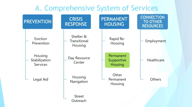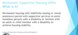 Rhodes says that permanent supportive housing is housing that is paired with support services and they are usually taking a household with someone with a disability, especially if they are receiving HUD funding, it has to be someone with a disability.
