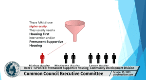 Linette Rhodes and Jim O’Keefe from Community Development Division are there to present. O’Keefe says in the past two years the city has done two Supportive Housing Development projects, one at Rethke (single adults) and one at Tree Lane (serving families). A third development had been proposed, it was delayed in the aftermath of some highly visible struggles at the two developments and ultimately cancelled. They have been evaluating what has and hasn’t worked since that time. Linette has slides with background and Sarah Lim (Housing Services Specialist) and Torrie Kopp Mueller (Homeless Services Consortium Coordinator) are also there and they can answer any questions they have.