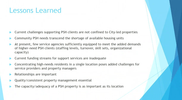 We saw a lot of changes in our system. We saw people in need of more street outreach services to access housing, because only people with high needs were getting into supportive housing. It impacted all of our system. That’s the back story of how we got here. Now we will talk about where we are not and what we have learned from our work since we opened the city-led developments.