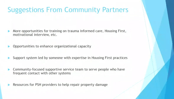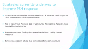 They have engaged with community partners to figure out what conversations they need to have as they move forward, to support the inventory we have now and as we expand. They gave us feedback that they need more training in trauma informed care, housing first, motivational interviewing and overall more trainings to come to Madison and the opportunity to send their individuals to national trainings. We have a very, very, very, very small budget though our CoC grant that we can maybe send one or two people a year to a national conference that are part of our non-profit community. As those conferences get more expensive that might dwindle more. People are begging for more opportunity to get education and support for their case managers. They are talking about enhancing organizational capacity. As we build more units we want a healthy ratio of case managers to residents and what we are missing in some situations are “middle management”, the agencies have Executive Directors and Case Managers but they need to a robust middle management. The case managers really need that support system to go to, to problem solve and some of the supervisors are supervising over 15 or 16 people who have high need cases and it gets pretty daunting. They also suggest a support system led by someone with housing First practices. We all have different roles in the system but there is no housing first specialist that can go to the agencies and help them with their staff structure and to problem solve. They also talked about a housing focused supportive service team to support people who have contacts with other systems. Even if someone gets into supportive housing they are still having interactions with the police, going to the ER a lot and they are having a hard time staying stable in their housing and maybe they are not connecting to the case manager at that site. They have talked about this for a while and have seen some best practices in other cities where there is a holistic team of potentially nurses, case managers, mental health trained persons that are not assigned to a project but are there to problem solve with the community. The last thing that the providers talked a lot about is resources to help when the property is damaged. A landlord mitigation fund. The turn over and expenses to get someone else off the streets and into that housing sometimes takes 6 months with the damages and up to $8,000. Some of that help to get units back on line in a timely manner.